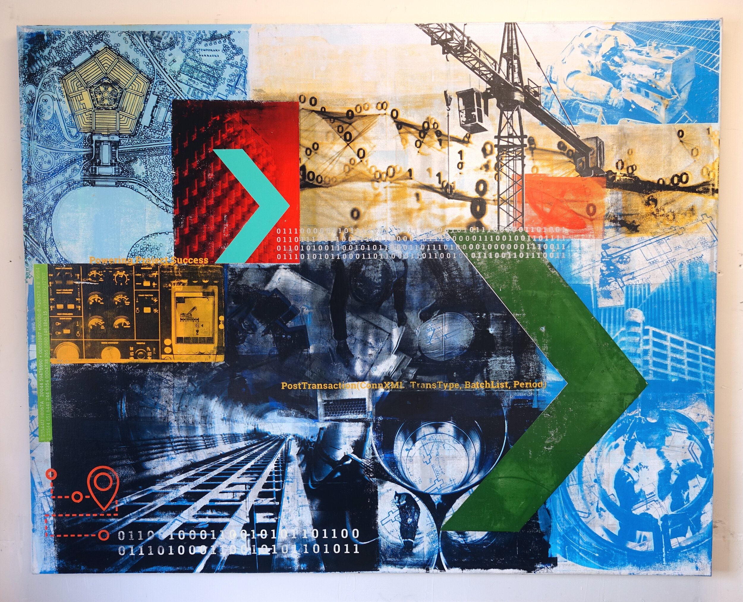 Original imagery and sourced imagery were used to create layered compositons on canvas and wood.
