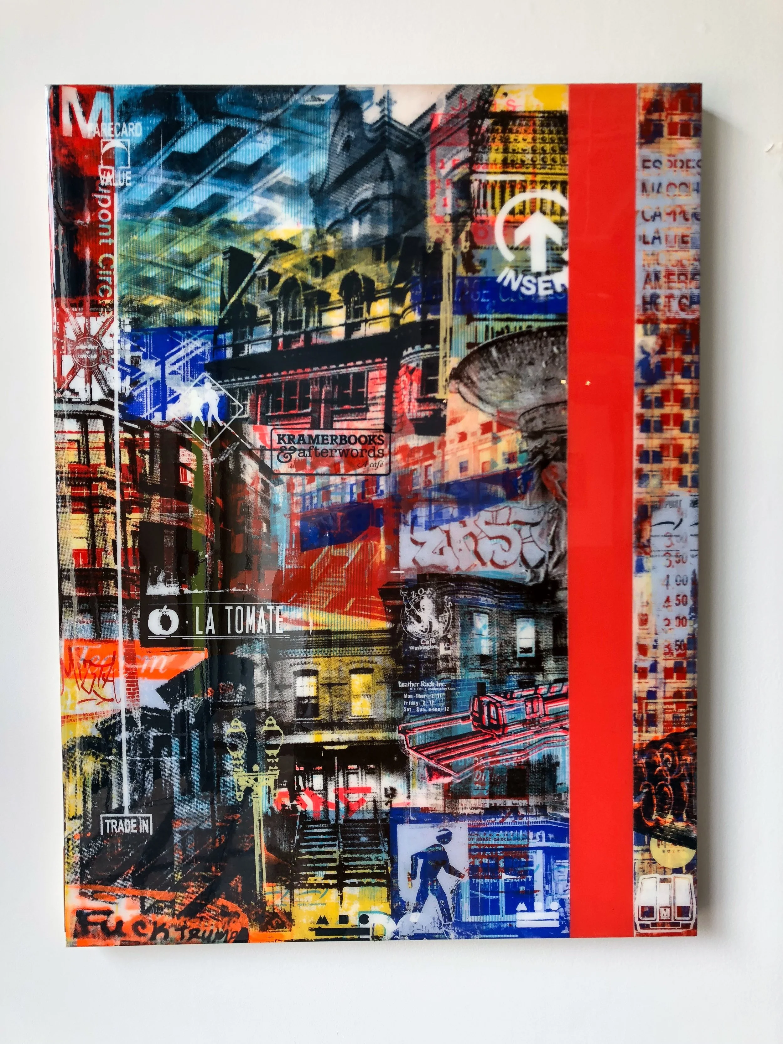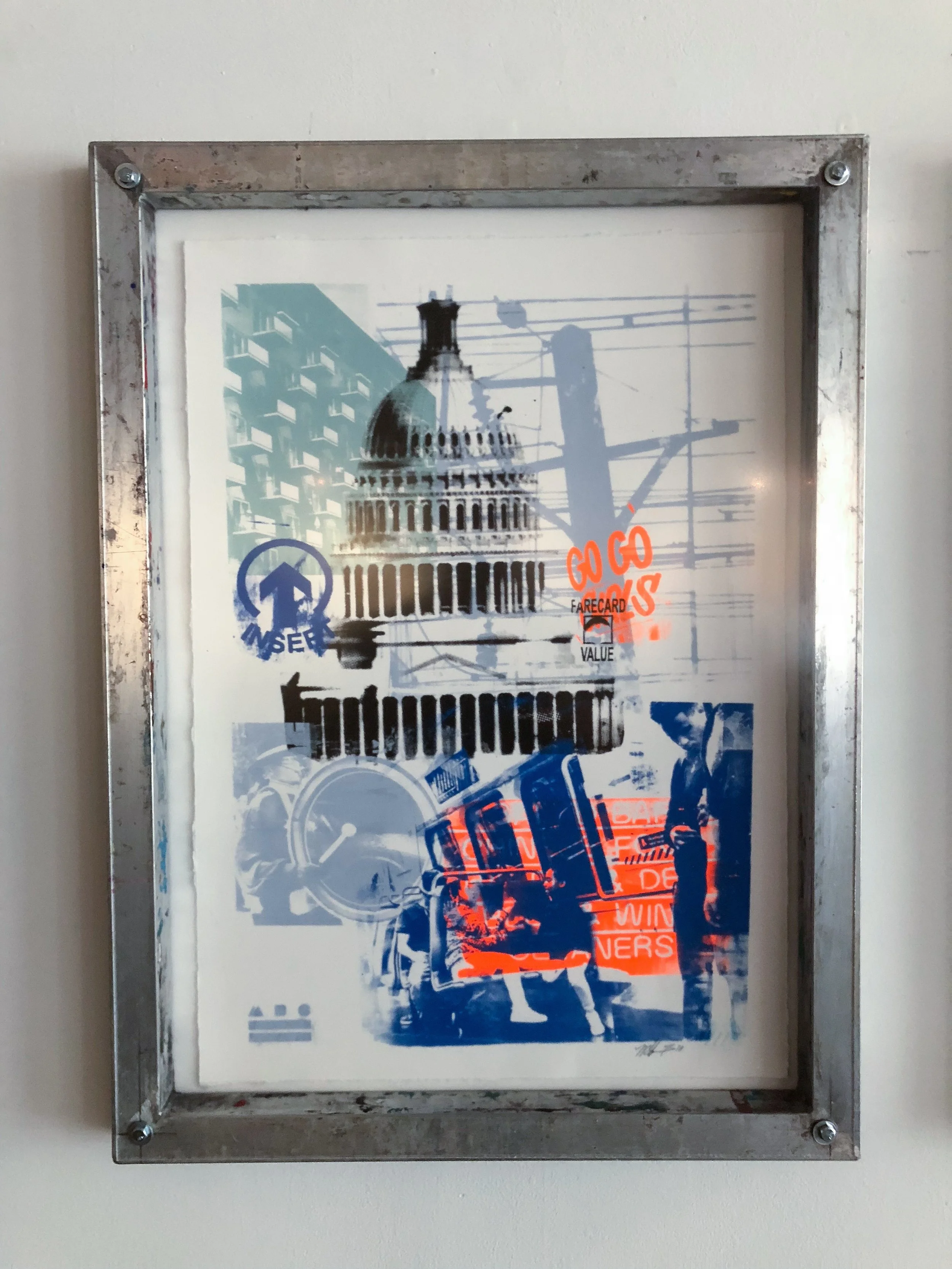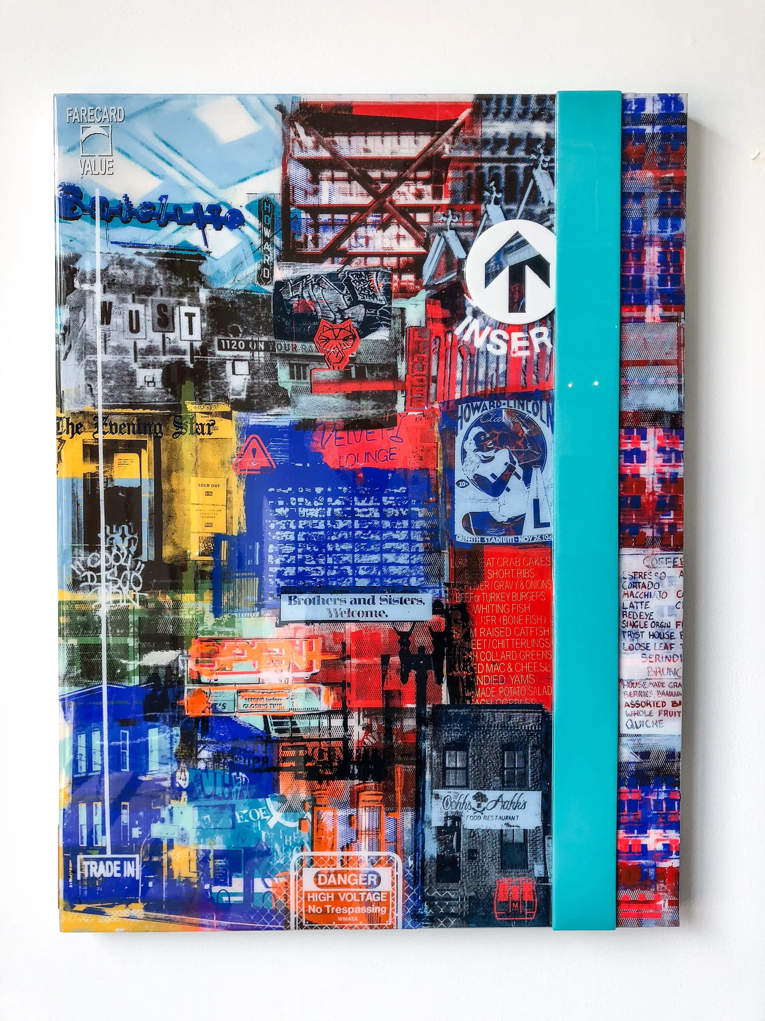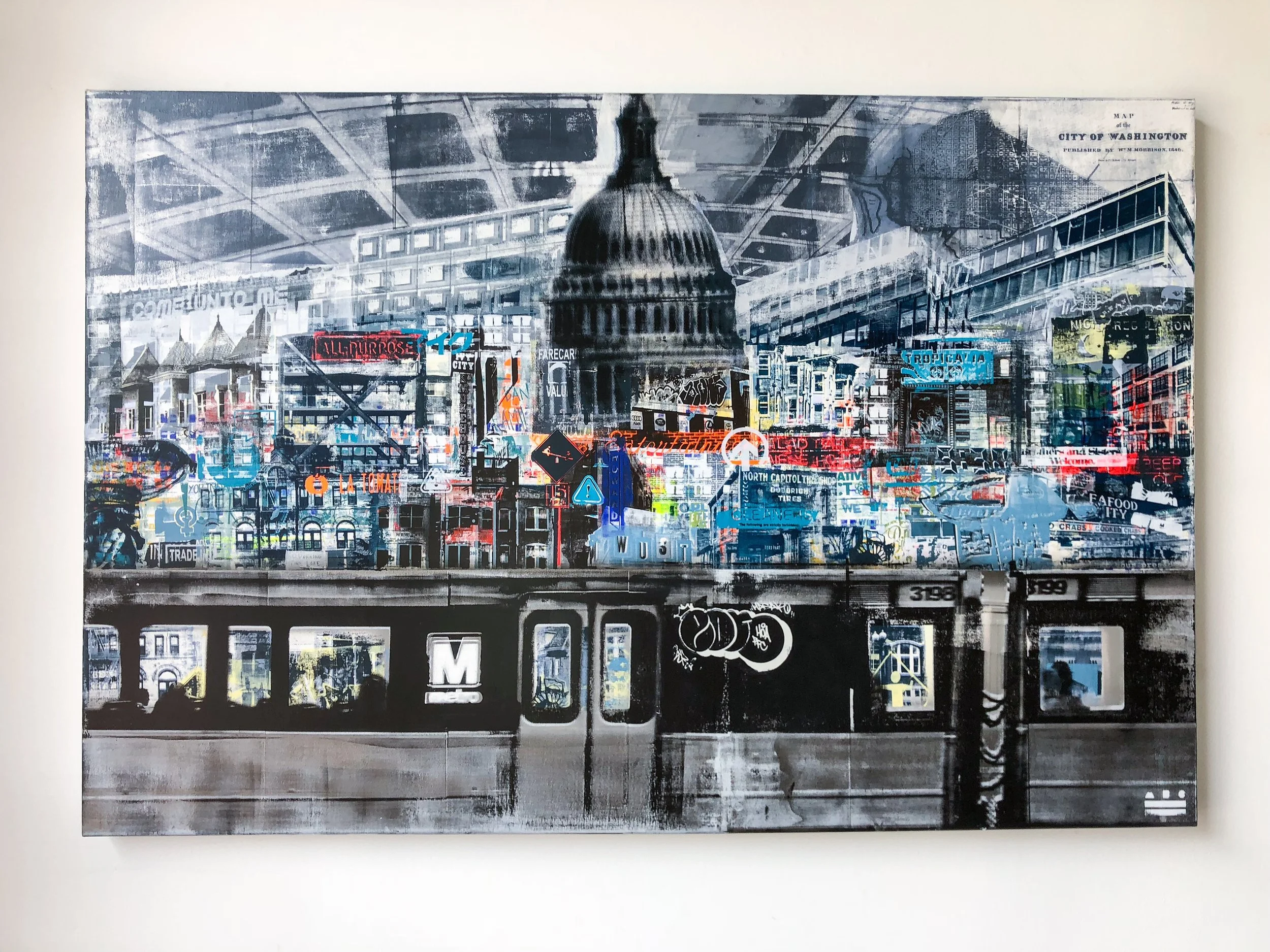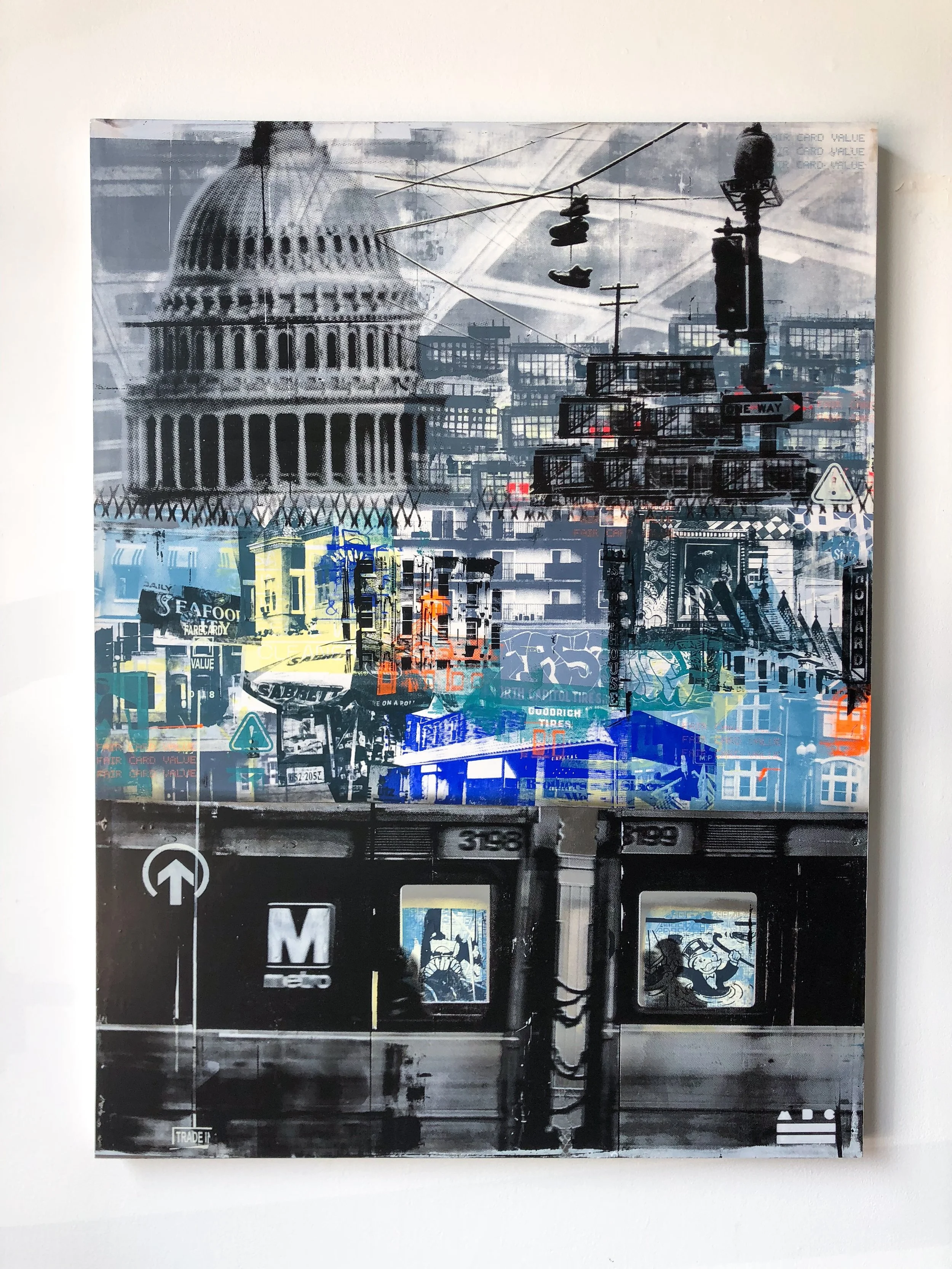 In Fair Card Value, Crossett’s unique process and distinct vision of life in Washington D.C. shine through. Referencing the now obsolete Metro fare card, many of the works are composed with layered imagery of DC landmarks behind the familiar magnetic stripe running the length of the right side of the artwork. Other pieces rely on the iconic, coffered architecture of the Metro tubes as a backdrop for other electric D.C. spots such as Black Cat, Howard Theater, Dacha and Dock Five. Metro cars themselves often shoot through the middle of his compositions, a nod to the past and also the speed in which this city is changing.