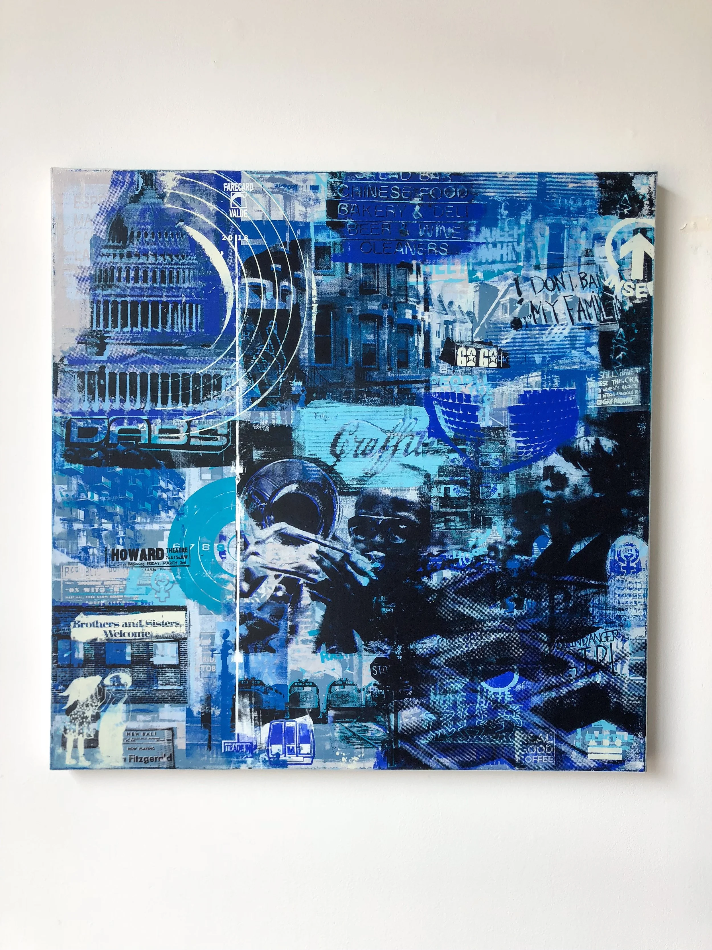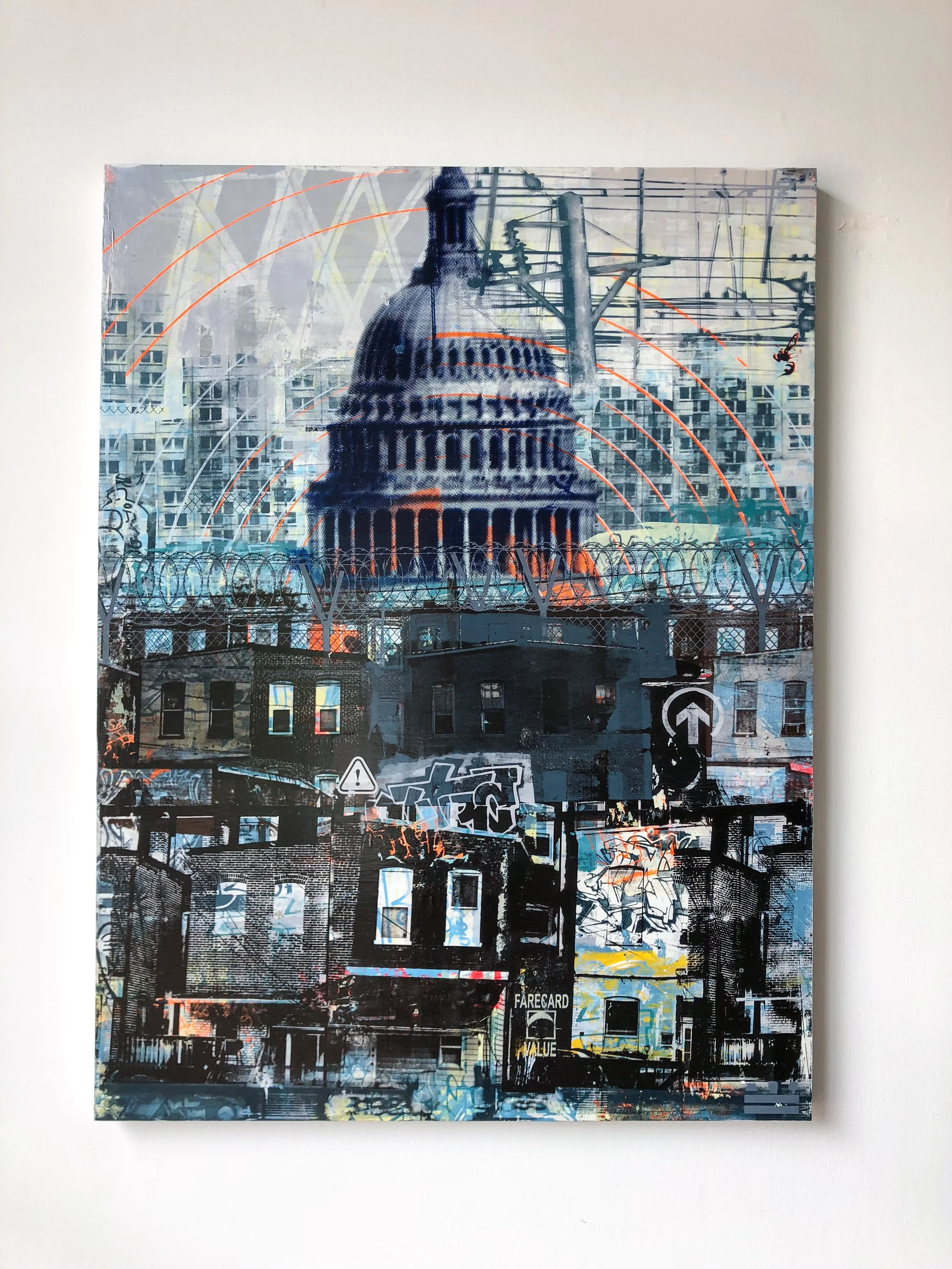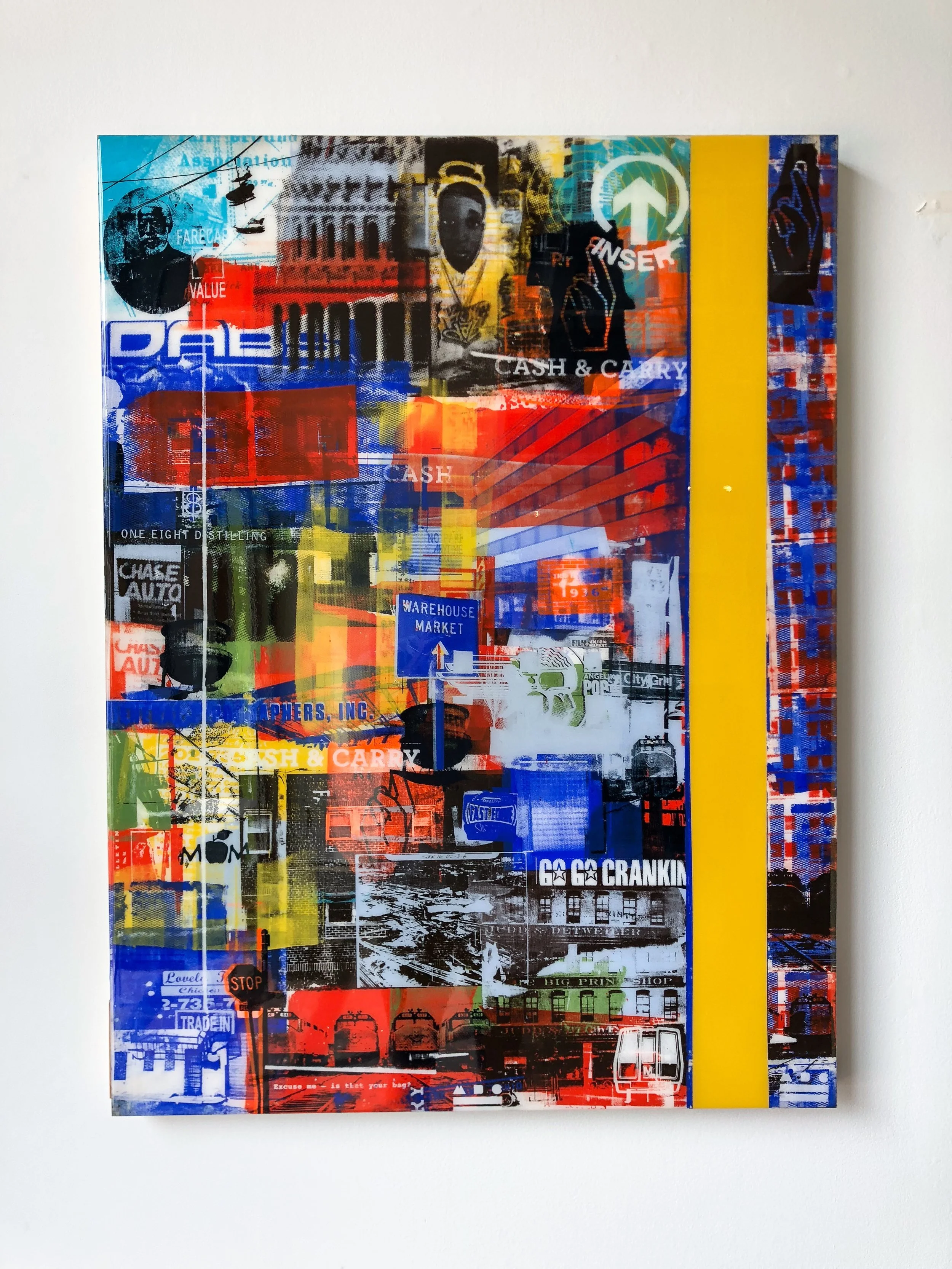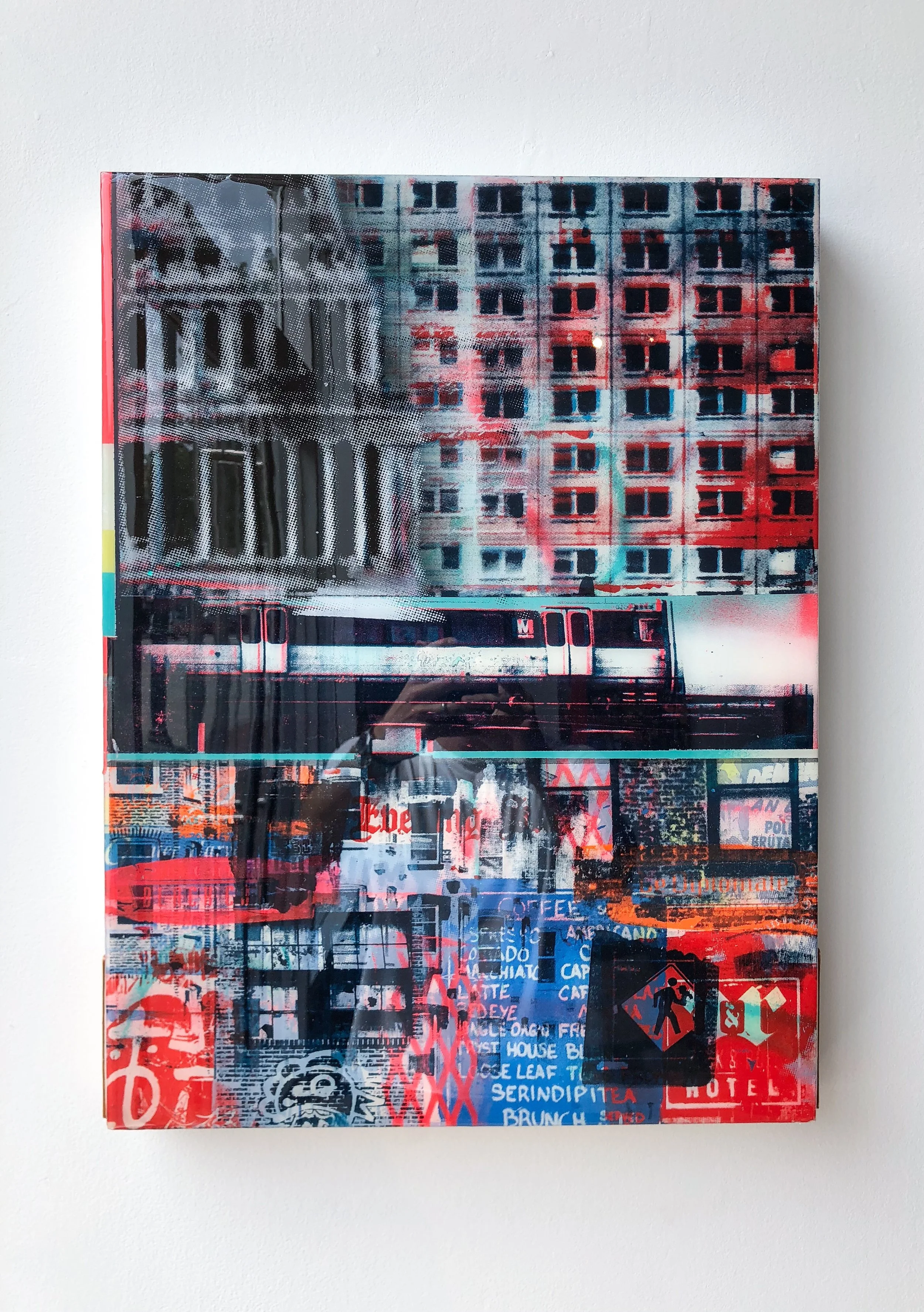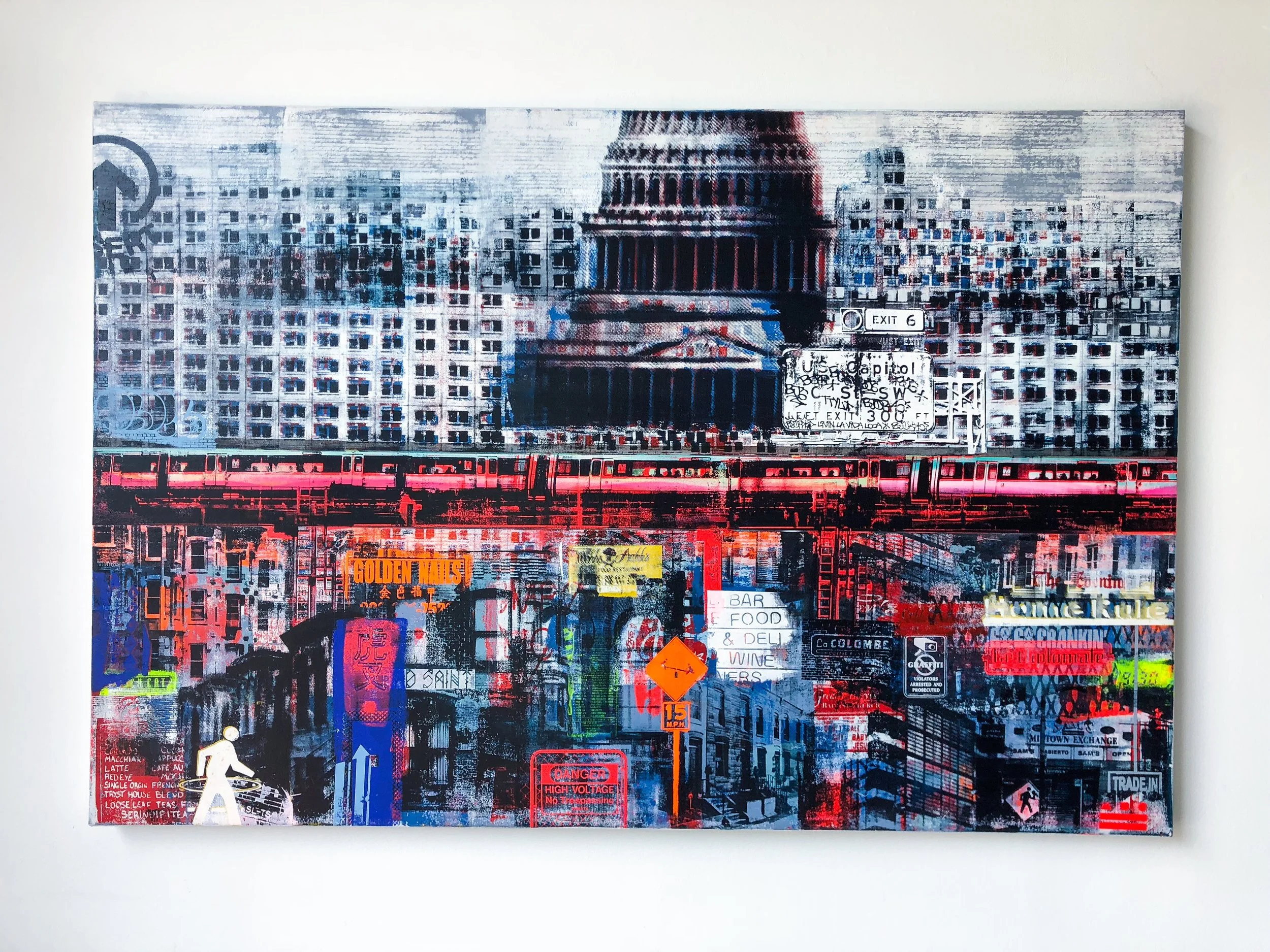 In Fair Card Value, Crossett’s unique process and distinct vision of life in Washington D.C. shine through. Referencing the now obsolete Metro fare card, many of the works are composed with layered imagery of DC landmarks behind the familiar magnetic stripe running the length of the right side of the artwork. Other pieces rely on the iconic, coffered architecture of the Metro tubes as a backdrop for other electric D.C. spots such as Black Cat, Howard Theater, Dacha and Dock Five. Metro cars themselves often shoot through the middle of his compositions, a nod to the past and also the speed in which this city is changing.