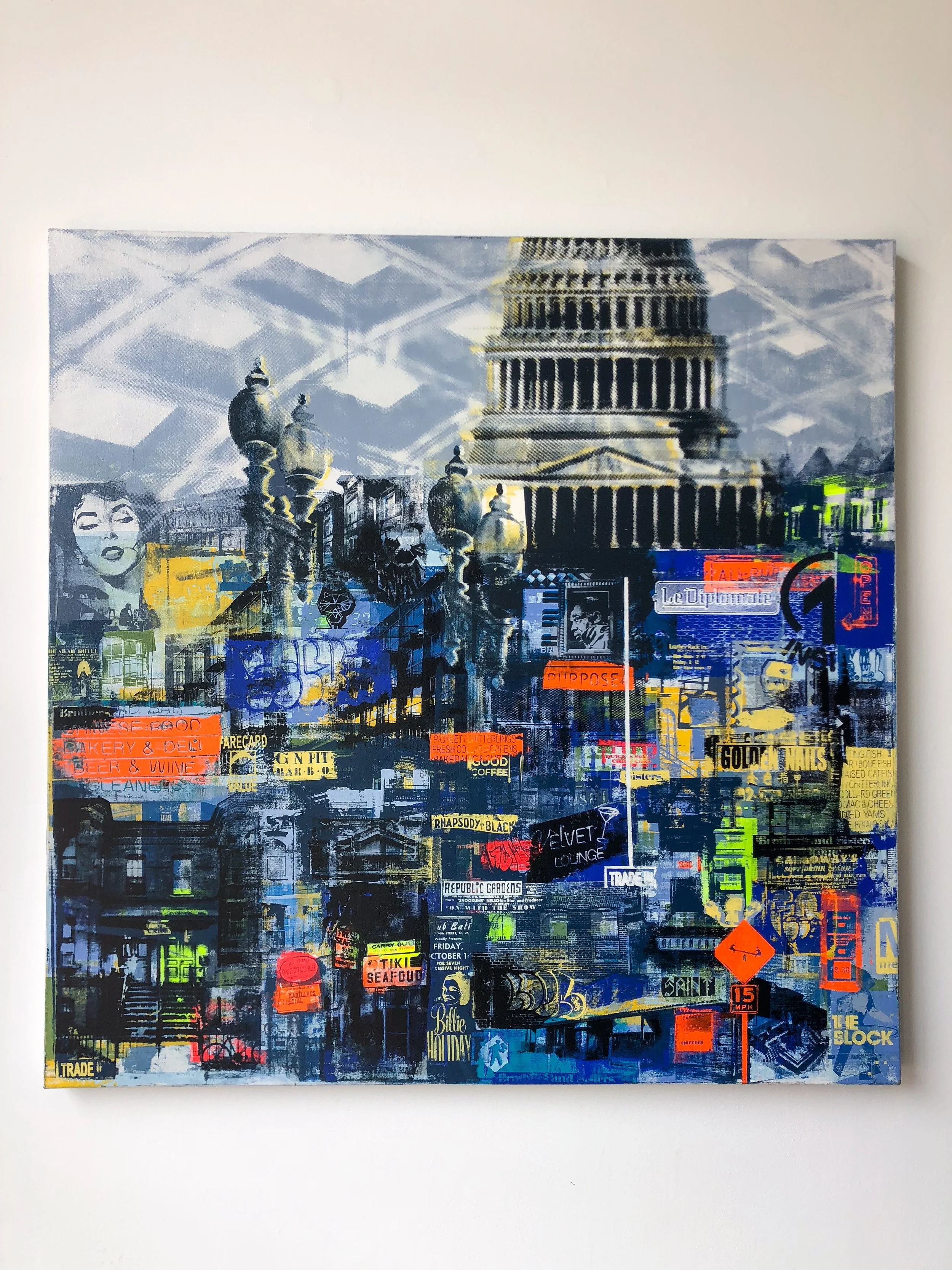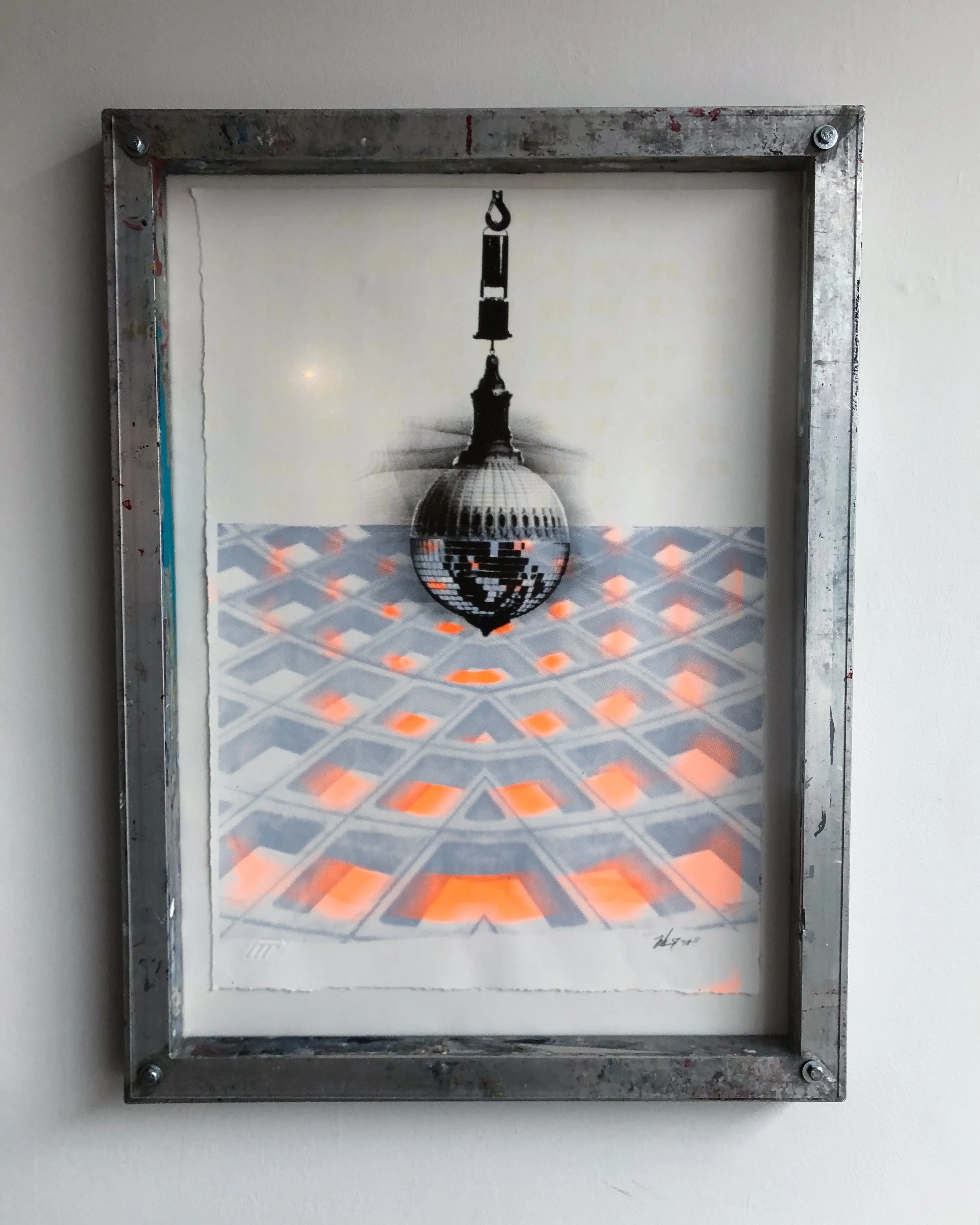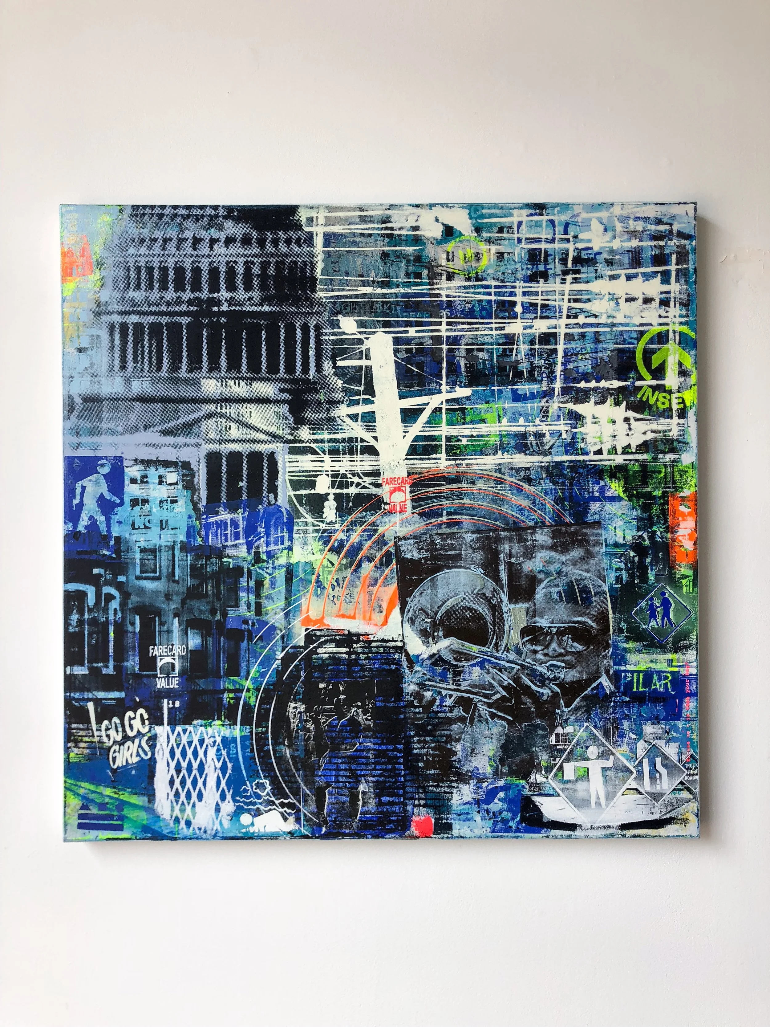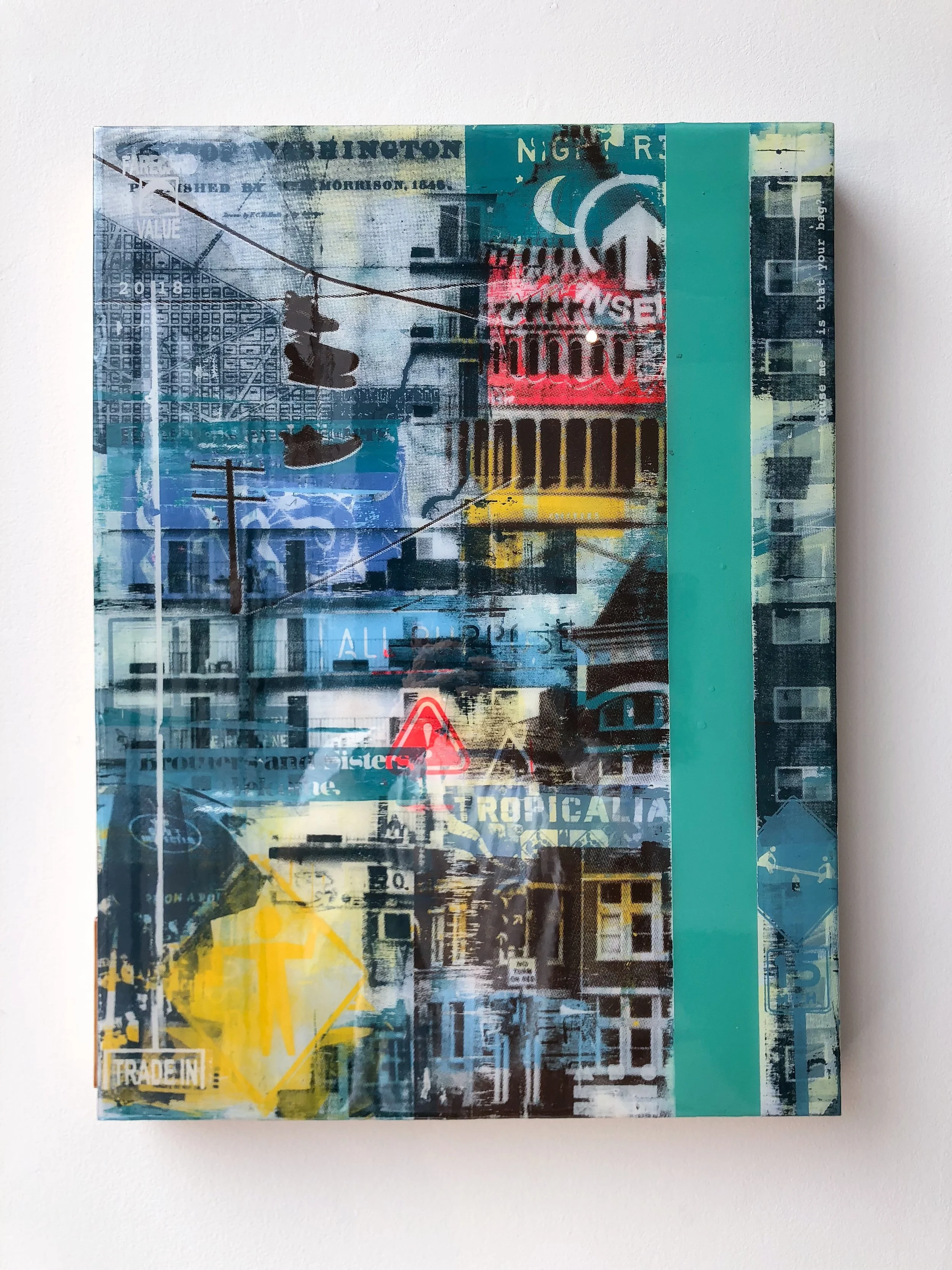 In Fair Card Value, Crossett’s unique process and distinct vision of life in Washington D.C. shine through. Referencing the now obsolete Metro fare card, many of the works are composed with layered imagery of DC landmarks behind the familiar magnetic stripe running the length of the right side of the artwork. Other pieces rely on the iconic, coffered architecture of the Metro tubes as a backdrop for other electric D.C. spots such as Black Cat, Howard Theater, Dacha and Dock Five. Metro cars themselves often shoot through the middle of his compositions, a nod to the past and also the speed in which this city is changing.