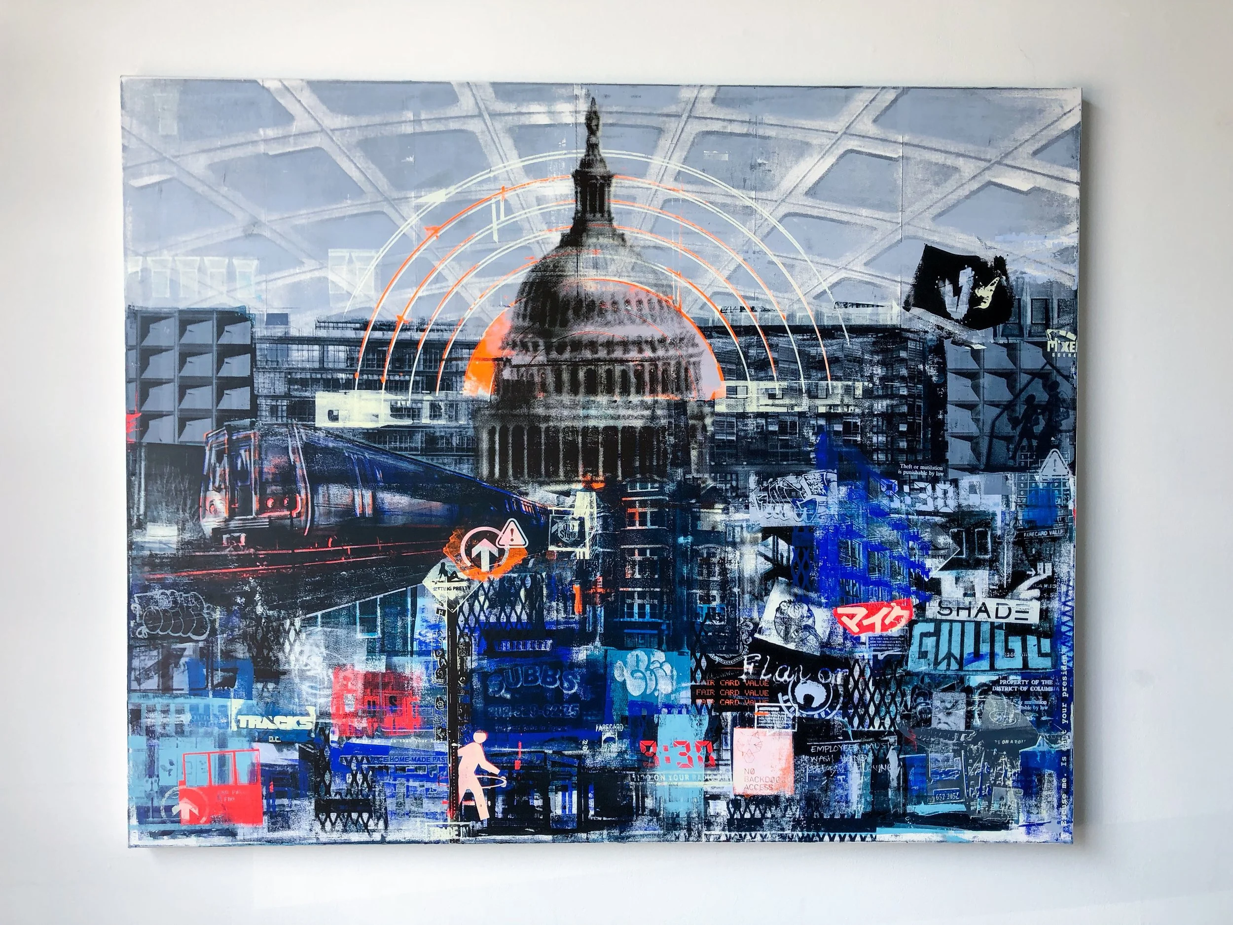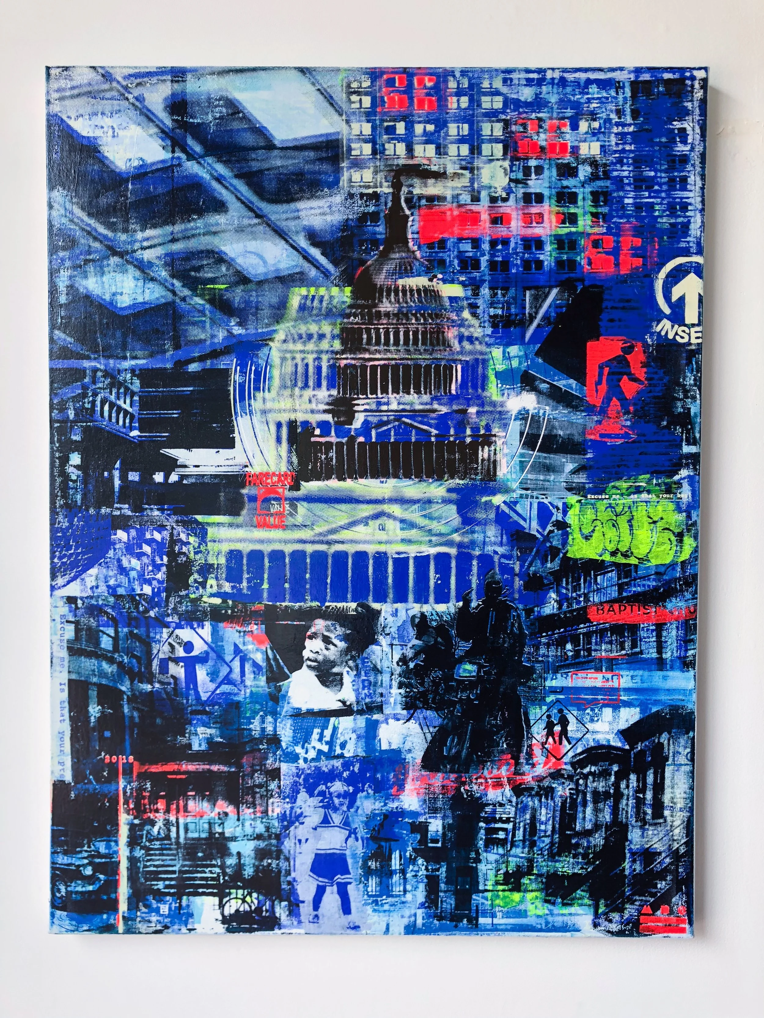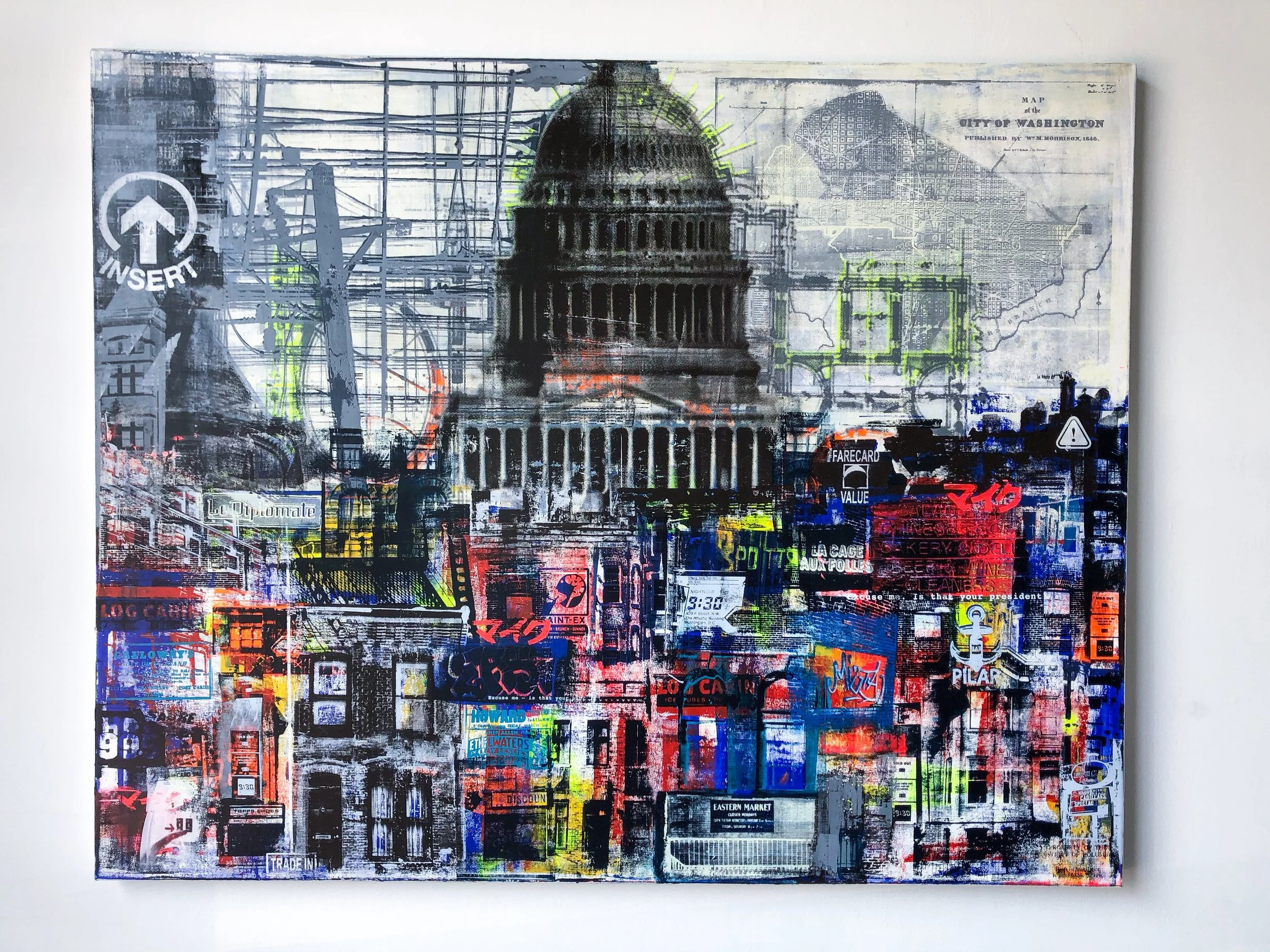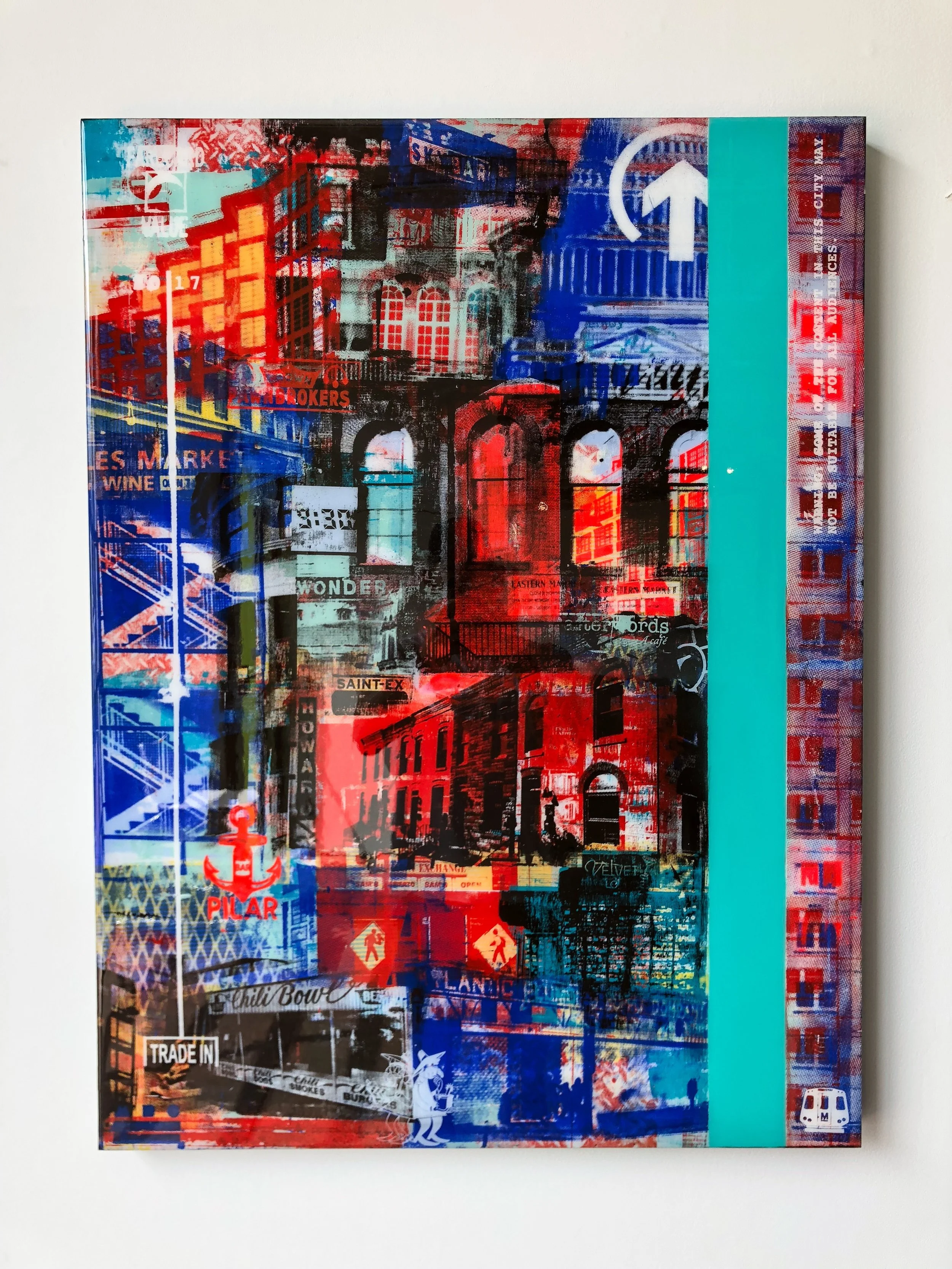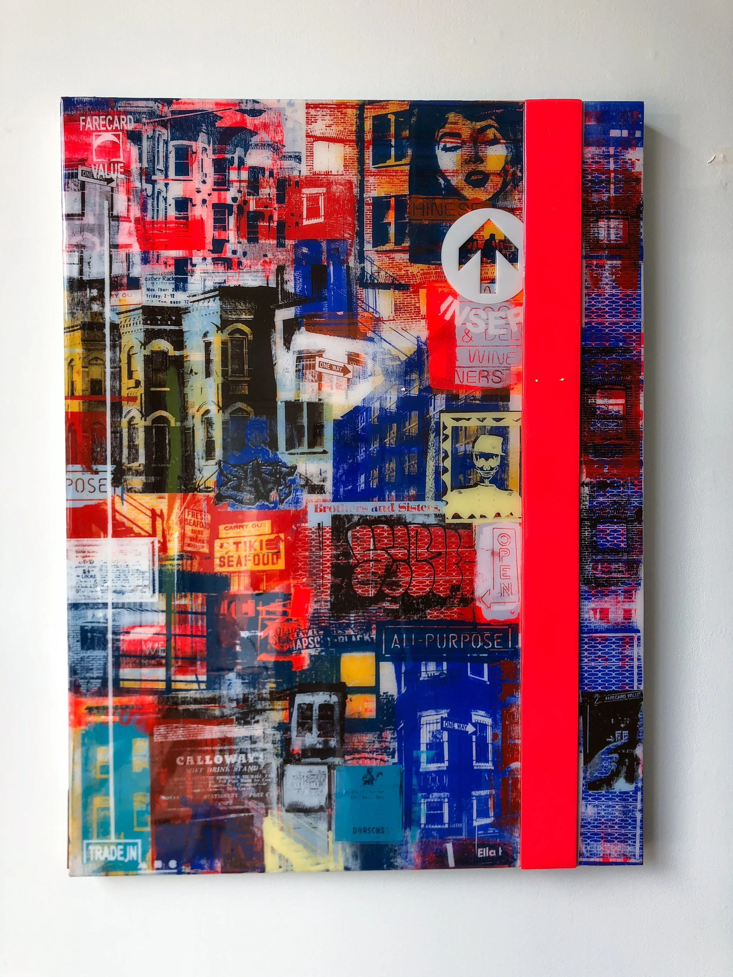 In Fair Card Value, Crossett’s unique process and distinct vision of life in Washington D.C. shine through. Referencing the now obsolete Metro fare card, many of the works are composed with layered imagery of DC landmarks behind the familiar magnetic stripe running the length of the right side of the artwork. Other pieces rely on the iconic, coffered architecture of the Metro tubes as a backdrop for other electric D.C. spots such as Black Cat, Howard Theater, Dacha and Dock Five. Metro cars themselves often shoot through the middle of his compositions, a nod to the past and also the speed in which this city is changing.