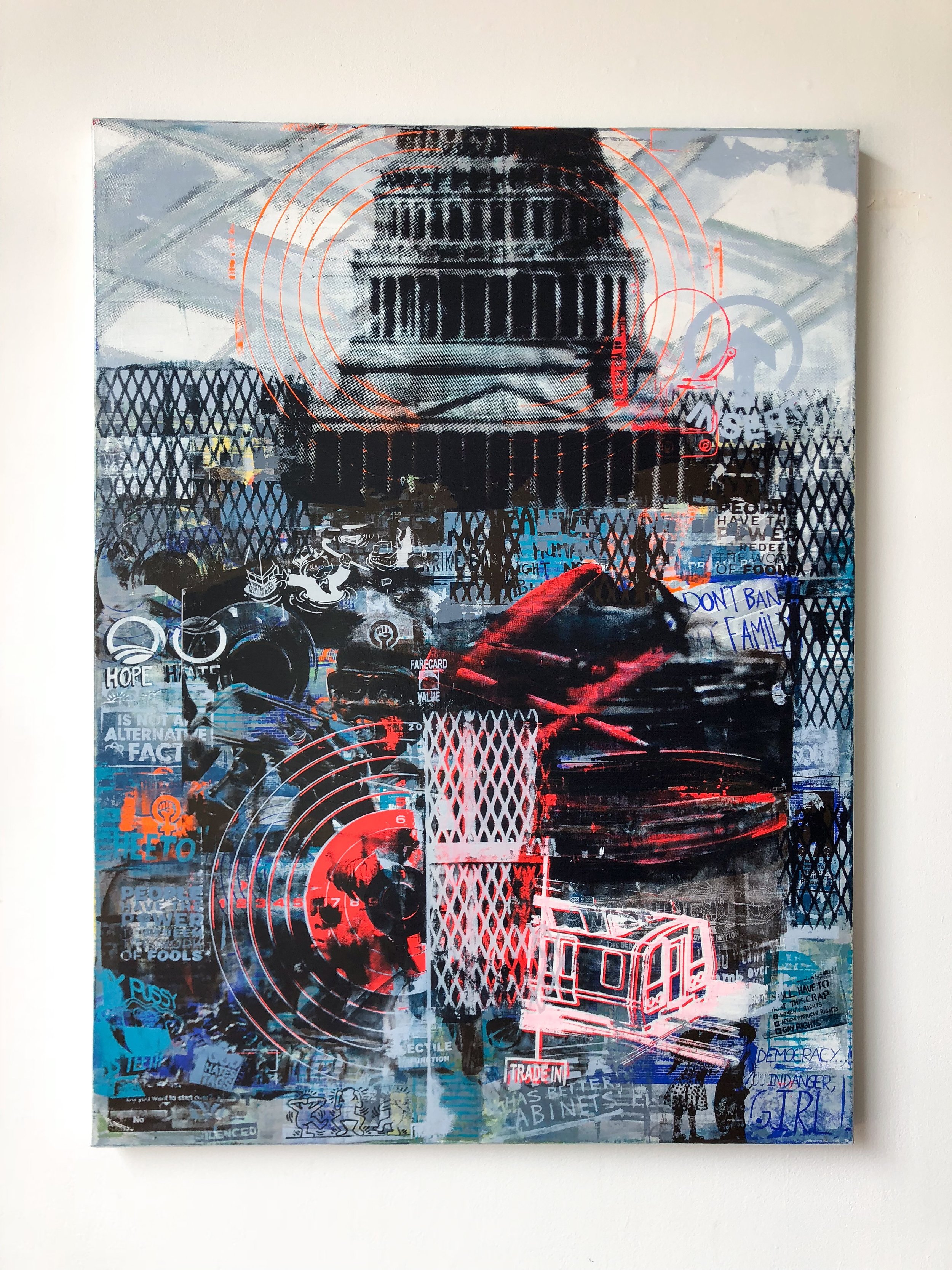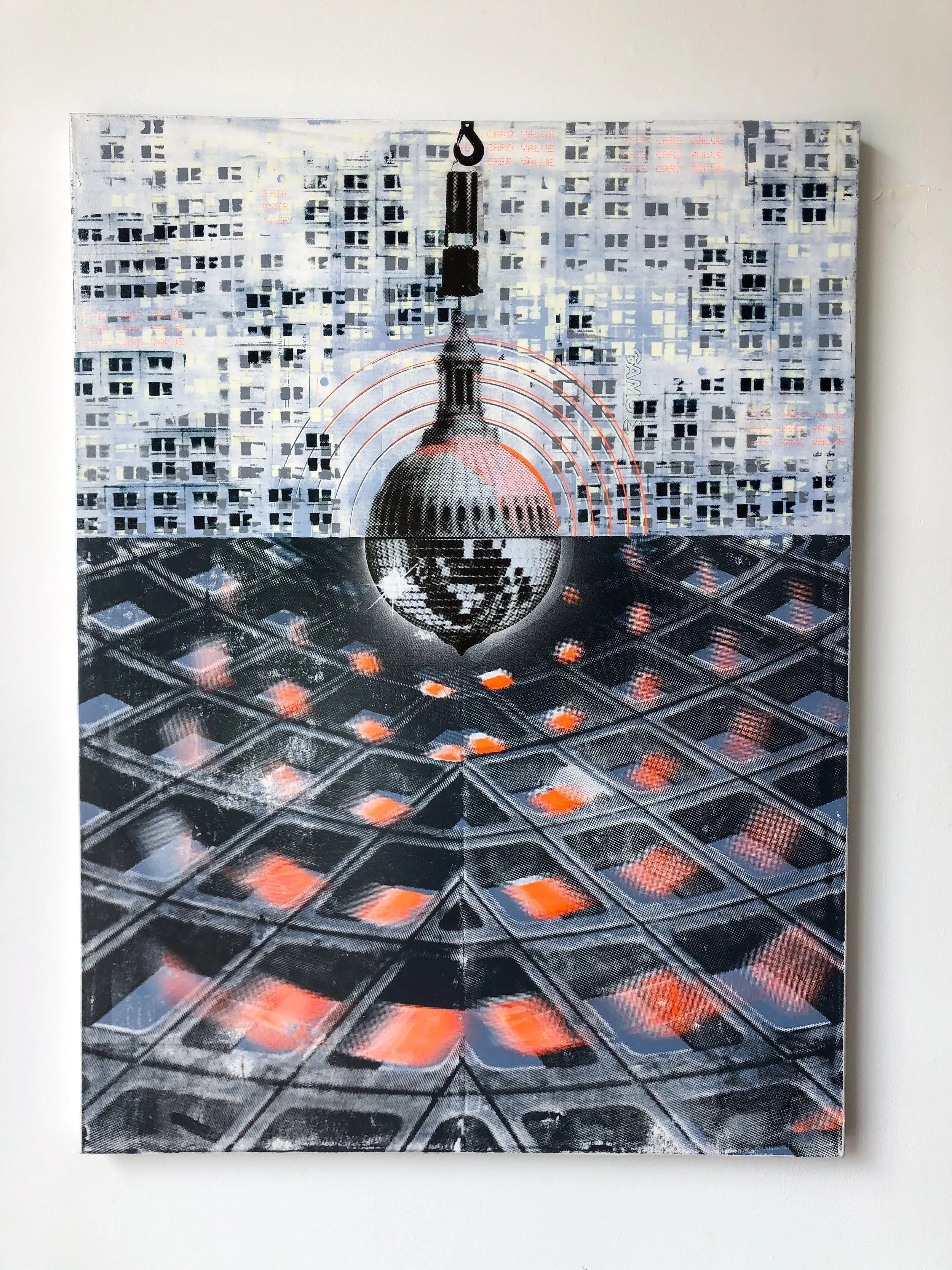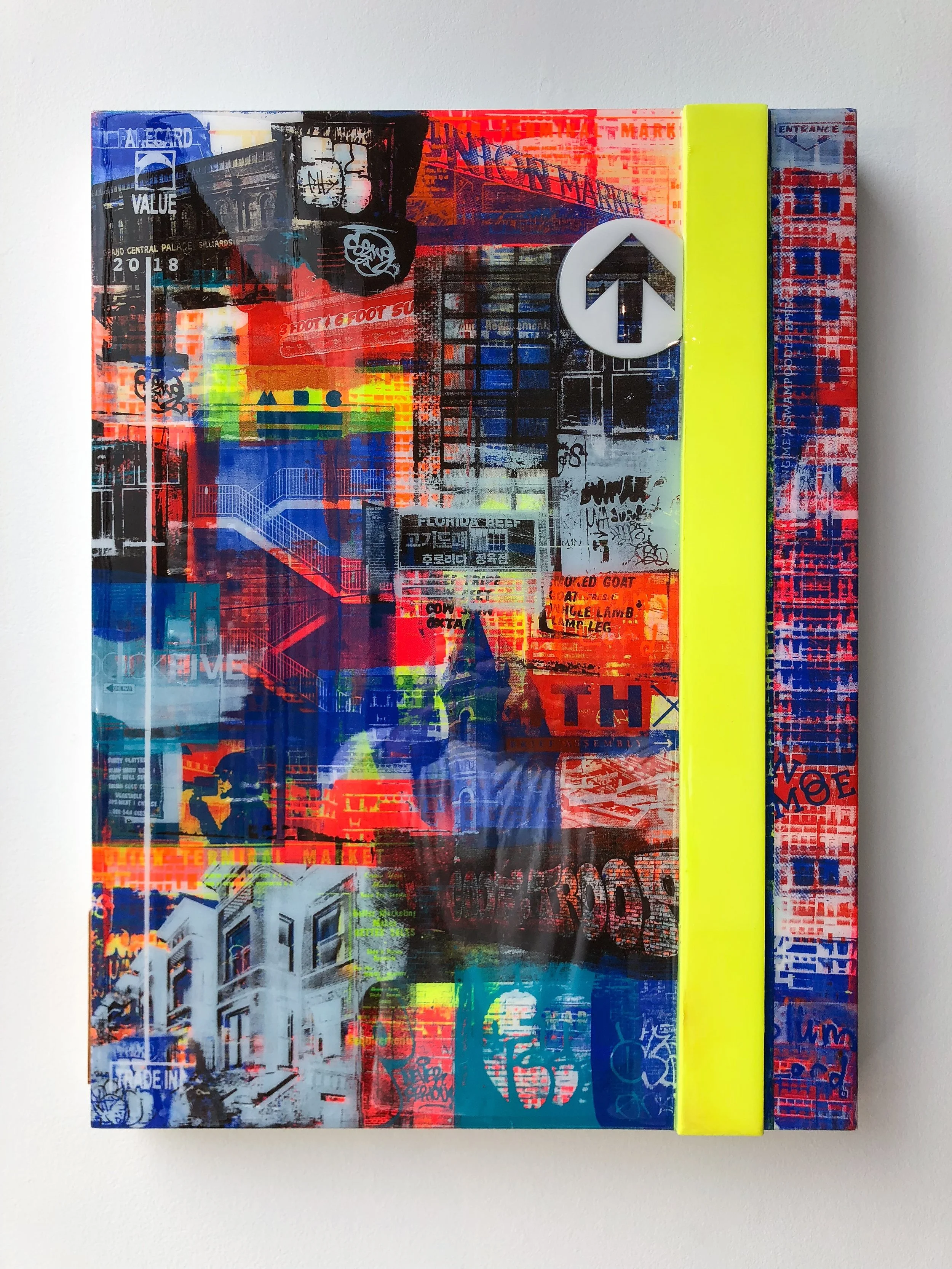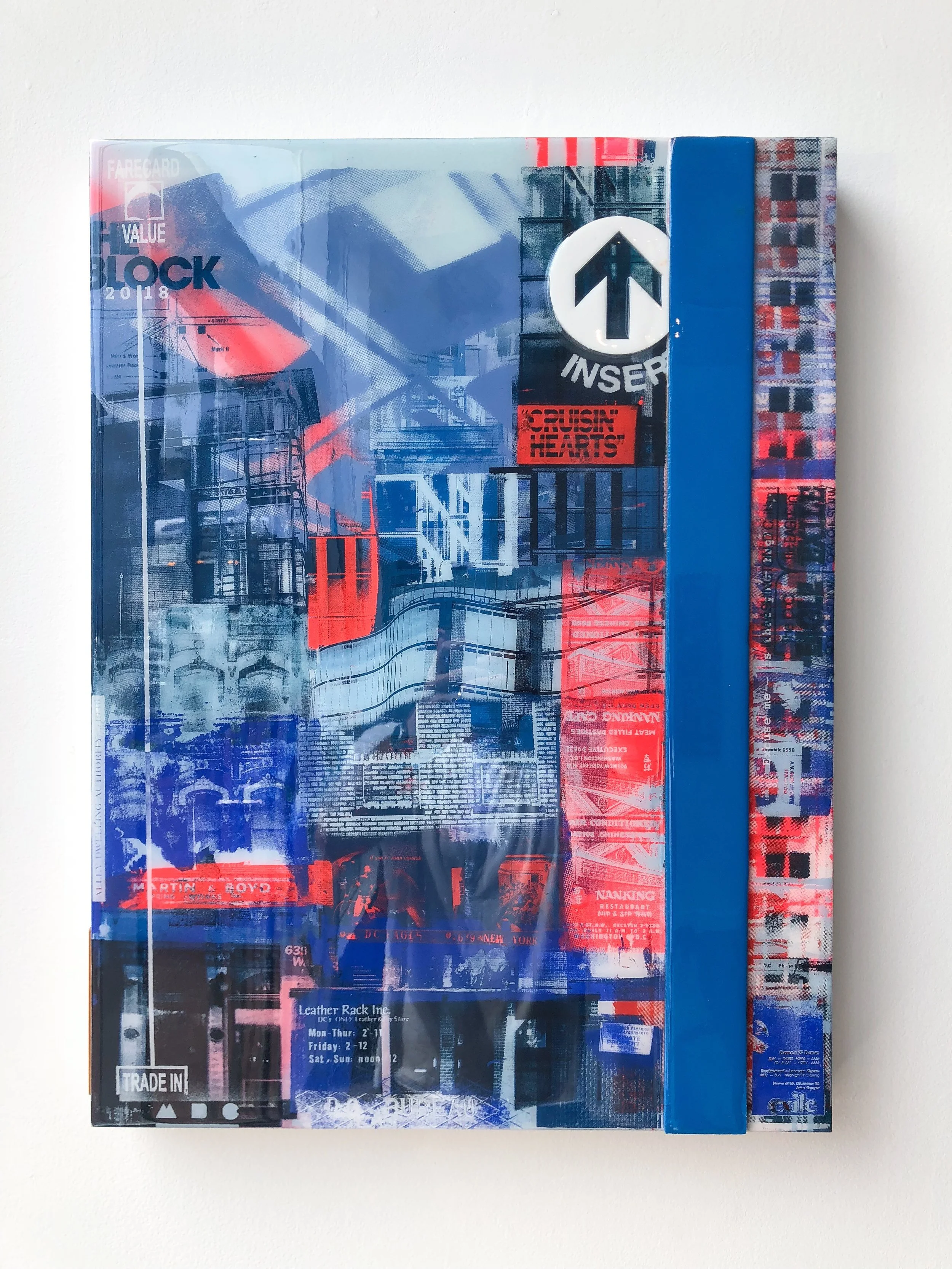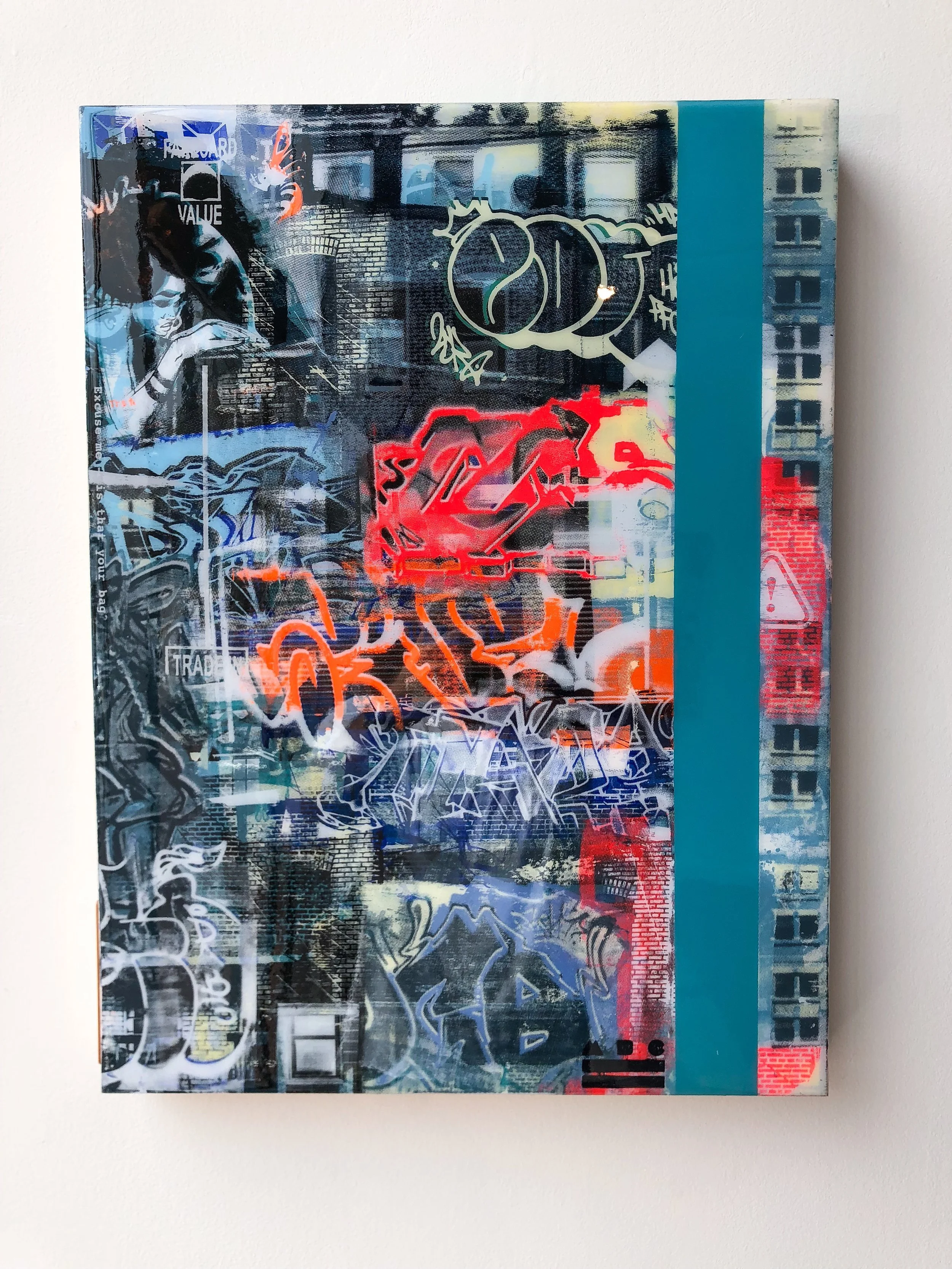 In Fair Card Value, Crossett’s unique process and distinct vision of life in Washington D.C. shine through. Referencing the now obsolete Metro fare card, many of the works are composed with layered imagery of DC landmarks behind the familiar magnetic stripe running the length of the right side of the artwork. Other pieces rely on the iconic, coffered architecture of the Metro tubes as a backdrop for other electric D.C. spots such as Black Cat, Howard Theater, Dacha and Dock Five. Metro cars themselves often shoot through the middle of his compositions, a nod to the past and also the speed in which this city is changing.