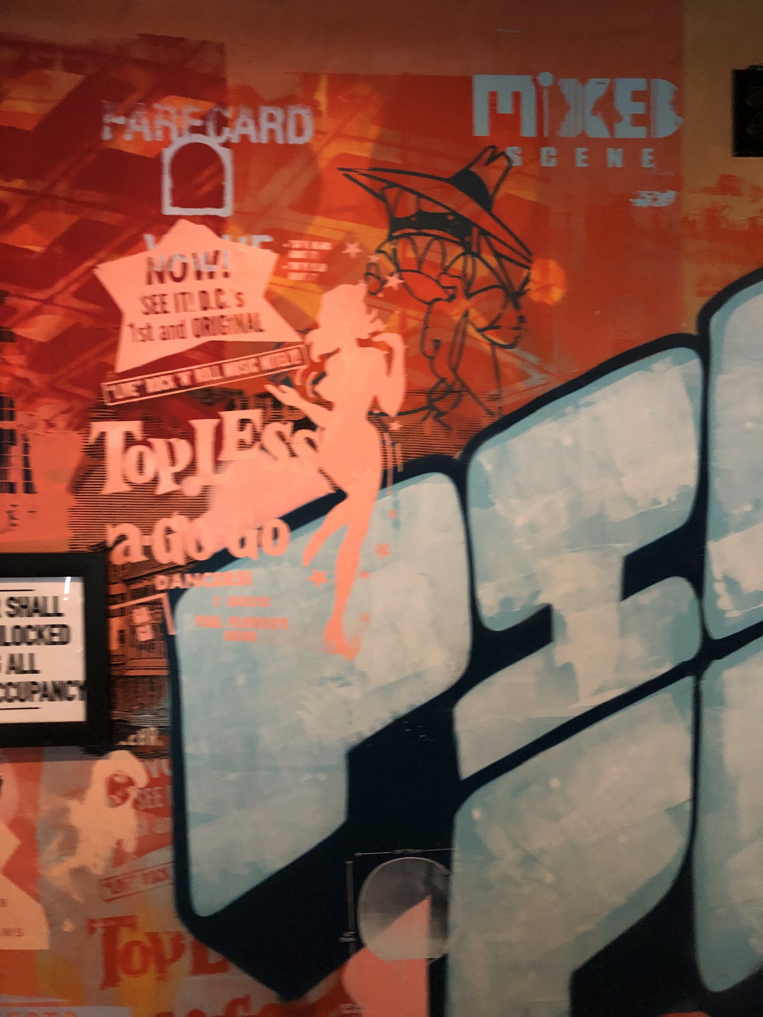 A mural was created by myself and @seivethecity mixing graffiti styling and tagging with historic imagery of the F Street area. The mural incorporates the areas history of peep shows, adult cinema, nightclubs, bars and restaurants with building architecture and signage.